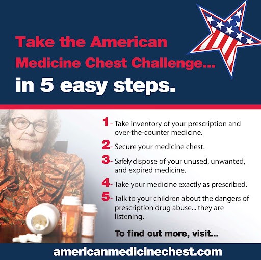 3. Take the AMCC 5 Step Challenge. Find a disposal drop box near you by visiting americanmedicinechest.com.