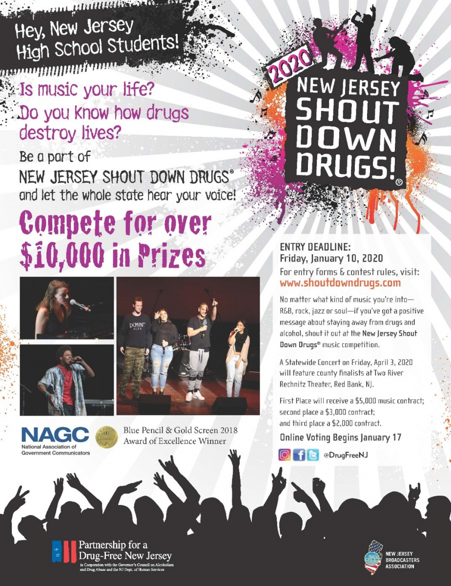 Created in 2005, New Jersey Shout Down Drugs challenges high school students to create original music and lyrics with powerful substance abuse prevention messages to allow teens to deliver the prevention message to each other through their favorite medium of music. County Finalists are chosen by peer judges to perform their original songs at the Annual Statewide Prevention Concert held every spring at a state-of-the-art venue. First, second and third place winners are chosen by a panel of judges that night to receive music contracts worth $5,000, $3,000 and $2,000, respectively, to perform their winning songs at different events throughout the state during the year. Through this website, the public is invited to vote for their favorite songs by participating in two phases of online voting. Since 2010, when the online voting began, over one million votes have been cast.