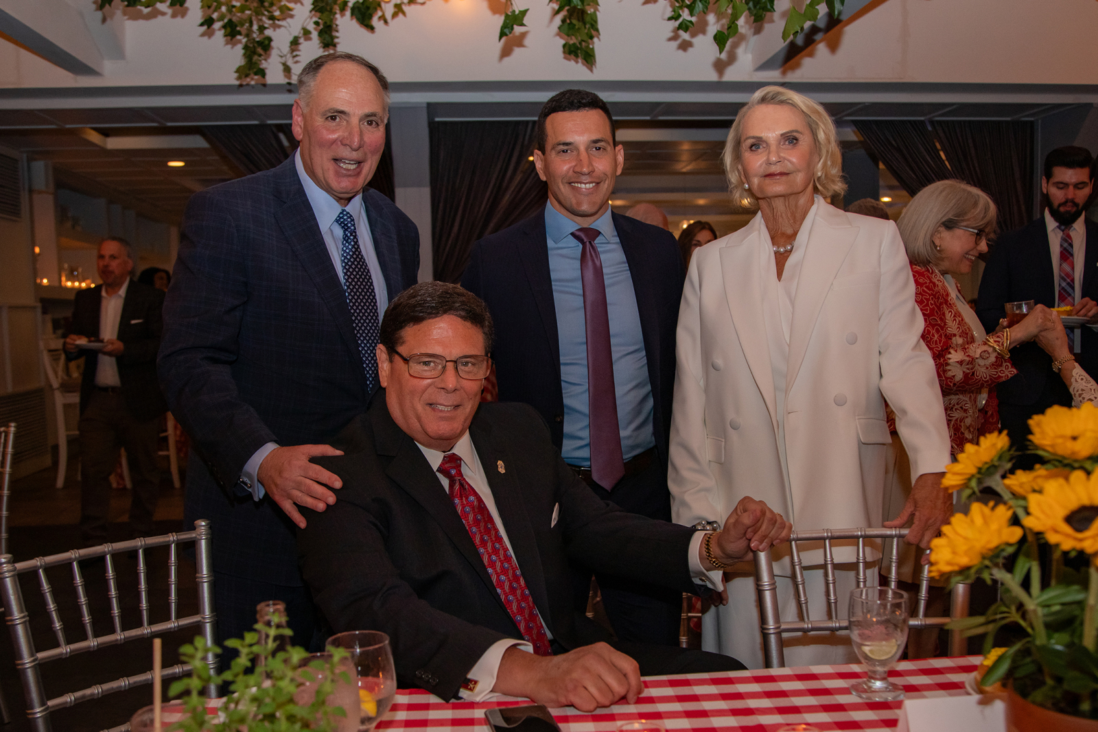 PDFNJ Executive Director Angelo Valente and PDFNJ Chair Elaine Pozycki are pictured standing with Dan Bowen, center, from WWOR/Fox 5, who accepted the Angel of Hope Award on behalf of the station. Seated is Paul S. Rotella, Esq., former President and CEO of the New Jersey Broadcasters Association, who received the JP Miele Lifetime Achievement Award