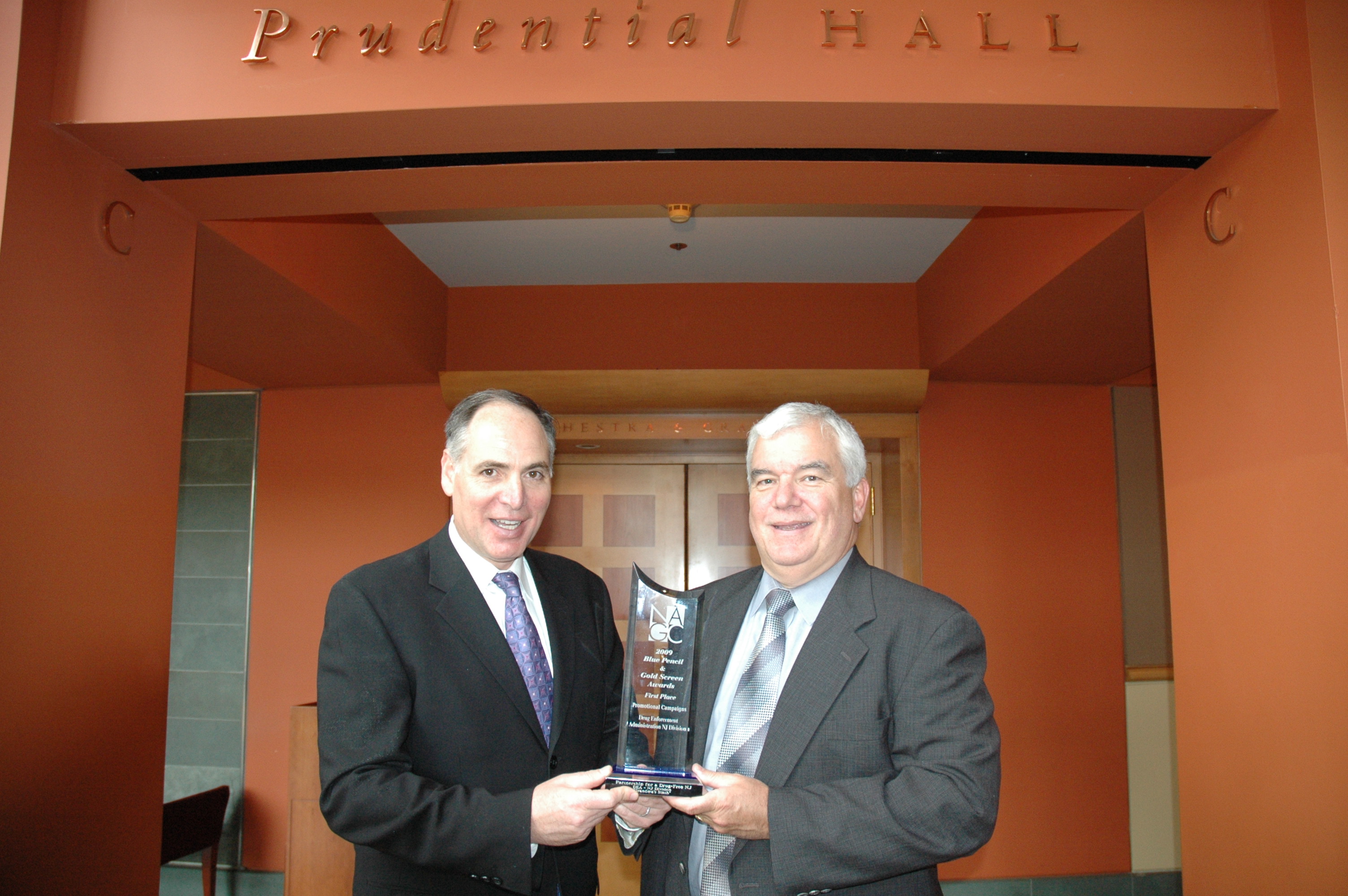From LEFT to RIGHT: Angelo M. Valente, Executive Director, PDFNJ and Gerard P. McAleer, Special Agent in Charge, Drug Enforcement Administration- NJ Division, accepting the Blue Pencil & Gold Screen Award.