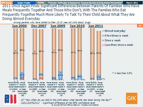“The role of parents in their child’s decision to use and abuse drugs is once again confirmed through this research,” explained, Joseph A. Miele, chairman of PDFNJ. “The 2011 Tracking Survey of Parents’ Attitudes & Behaviors Toward Drug and Alcohol Abuse Prevention also found that New Jersey parents, by the simple act of eating a meal with their child, are creating an environment for their children to feel comfortable about approaching them with discussions about drugs and alcohol.