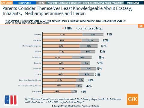 The study also found New Jersey parents lack knowledge on ecstasy, inhalants, methamphetamines and heroin, however, the more frequent the exposure to drug prevention public service announcements (PSAs) the more aware they became about the risks of using drugs and alcohol and the more encouraged they became to speak with their children about the risks of using and abusing drugs. Seven in ten (69%) parents say they see or hear public service announcements telling them about the risks of drugs or alcohol at least one time per week.