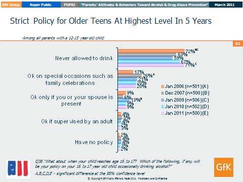 Parents are also getting the message about the dangers of underage drinking, as 71% of parents of a 12 to 15 year old child said their child would never be allowed to drink when they are older in their late teens, up from 67% last year, and at the highest level since 2006.